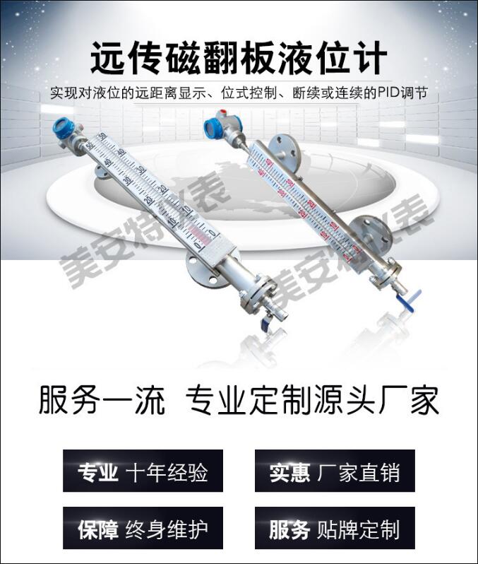該係列磁性浮子羞羞视频APP黄在线下载可以做到高密封,防泄漏和適應高壓高溫、腐蝕性條件下的液位測量,具有可靠的安全性, 它彌補了玻璃板(管)羞羞视频APP黄在线下载指示不清晰,易破碎的不足,不受高、低溫度劇變的影響,不需多組羞羞视频APP黄在线下载的組合。全過程測量無盲區,顯示醒目、讀數直觀,且測量範圍大。 特別是現場指示部分,由於不與液體介質直接接觸,所以對高溫、高壓、高粘度、有毒有害、強腐蝕性介質,更顯其優越性。因此,它比傳統的玻璃管,板式羞羞视频APP黄在线下载具有更高的可靠性、安全性、先進性、實用性。